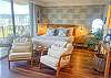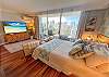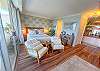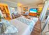 The living & sleeping area split space – a cozy loveseat is located at the foot of the queen size bed (sleeps 2), paired with 2 mid-century modern chairs, plus a 65” flat screen smart TV, atop a boho-modern, Acacia wood media console with extra storage for clothing. Other unique touches include a decorative, traditional wooden surfboard, coffee table books, full length mirror & bamboo luggage rack.