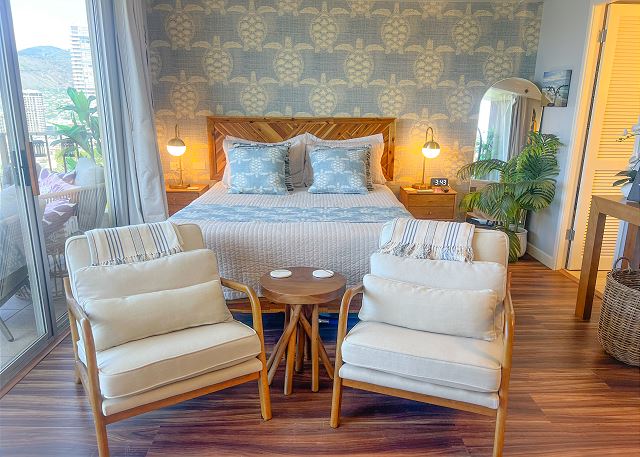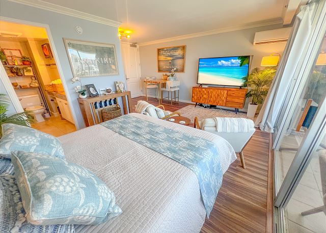 This gorgeous Waikiki studio is located at the beginning of Waikiki with easy access to some of the best Oahu has to offer. At the luxurious “Royal Garden” building, guests are free to enjoy the gardens, pool, sauna, BBQ grills, fitness center, 24/7 laundry room with complimentary washers & dryers, and more great amenities! In addition to AC, free Wi-Fi/cable, and a smart TV, this studio features a private Zen lanai perfect for lounging in the Hawaiian sun & fresh air, plus defined sleeping, living, and dining areas.