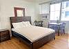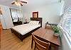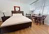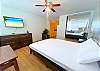 Living area offers a queen size bed (sleeps 2), closet, flatscreen tv, convertible work desk or dining table, and dresser with large windows for abundant natural light.